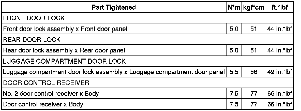 SPECIFICATIONS: DOOR LOCK: TORQUE SPECIFICATIONS