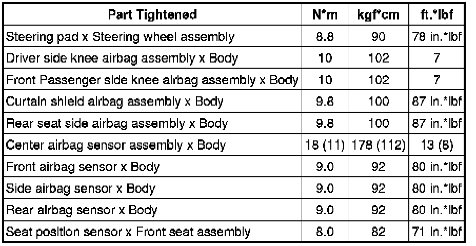 SPECIFICATIONS: SUPPLEMENTAL RESTRAINT SYSTEMS: TORQUE SPECIFICATIONS