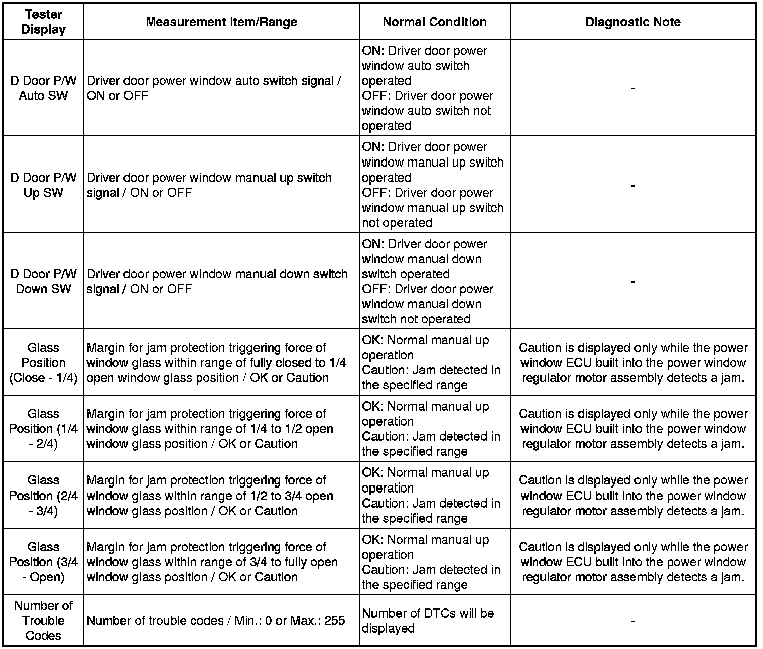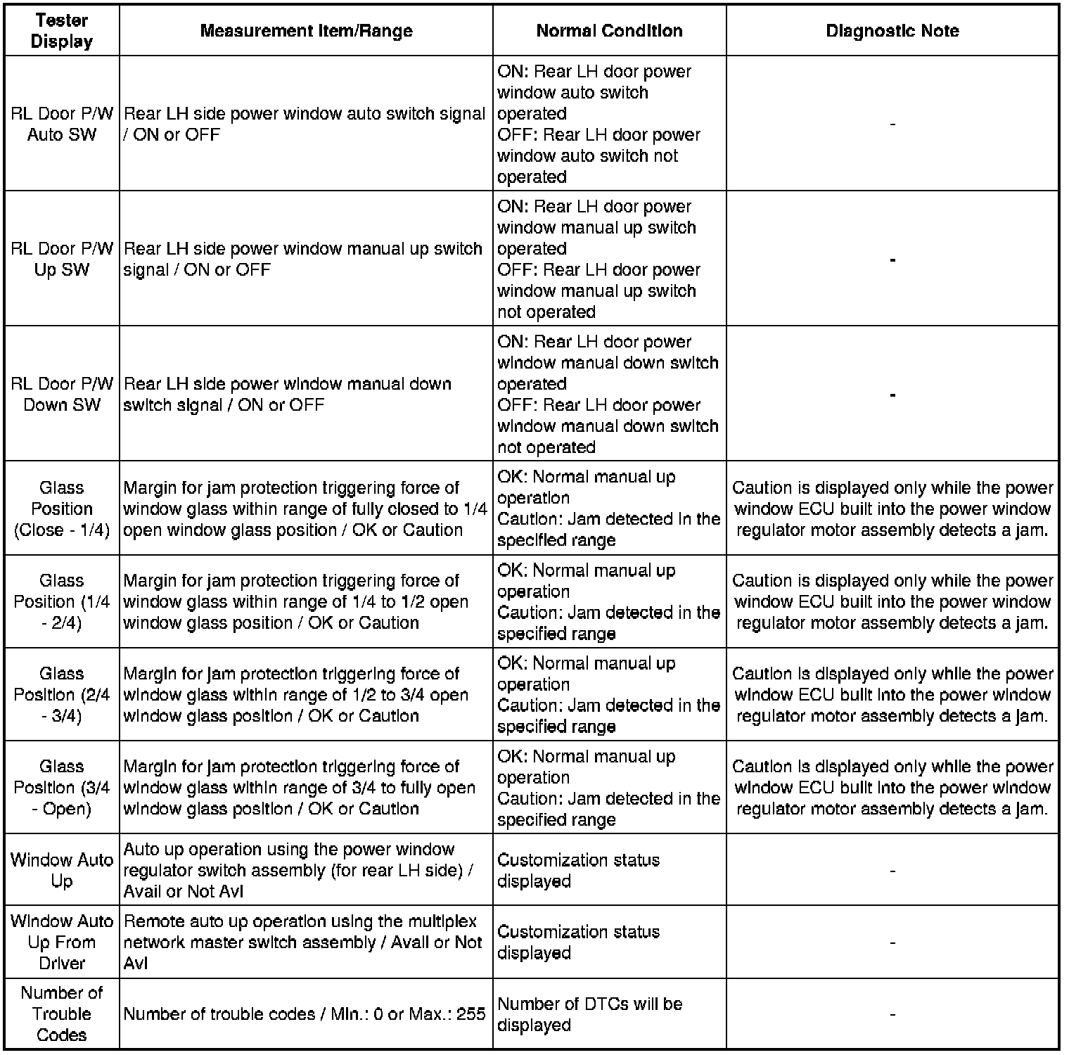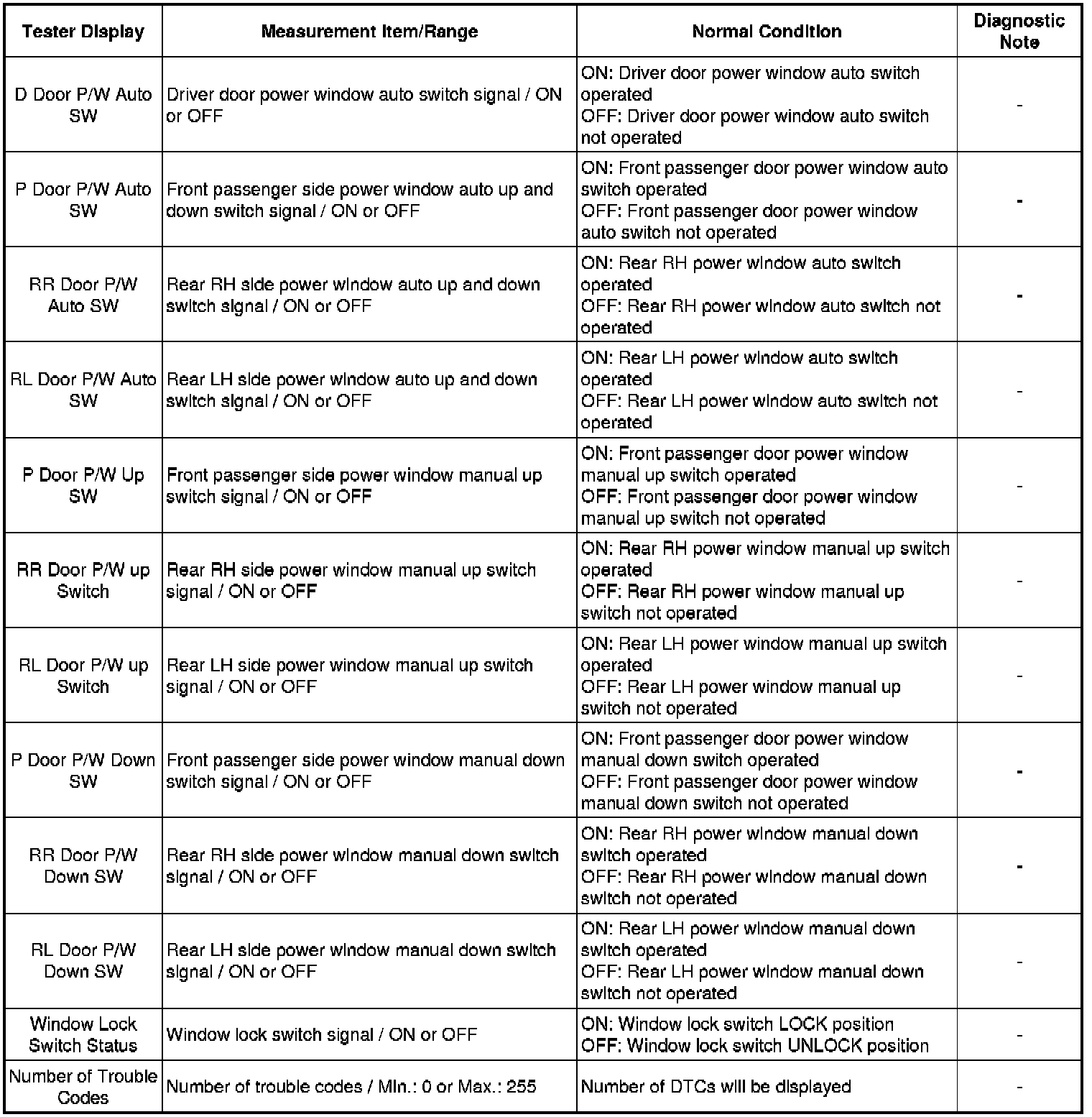 WINDOW / GLASS: POWER WINDOW CONTROL SYSTEM: DATA LIST / ACTIVE TEST