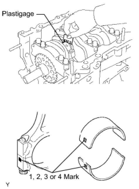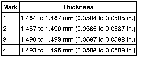 If replacing a bearing, replace it with one that has the same number as its respective connecting rod cap. Each bearing's standard thickness is indicated by a 1, 2, 3 and 4 mark on its surface.