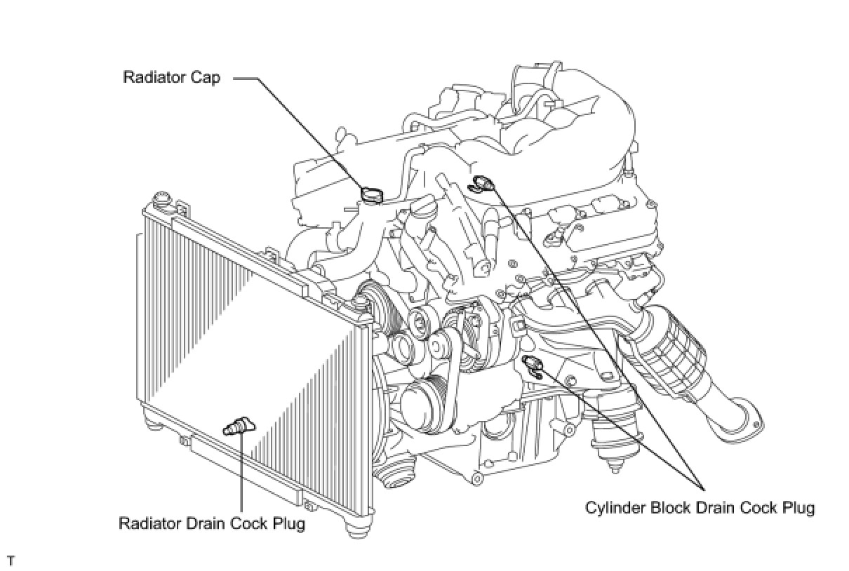 (b) Loosen the radiator drain cock plug and 2 cylinder block drain cock plugs. Then drain the coolant.