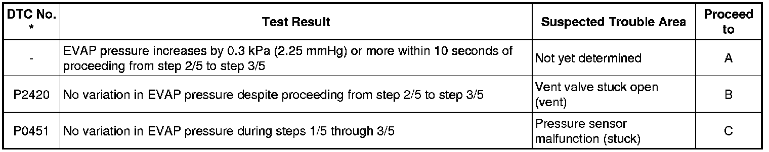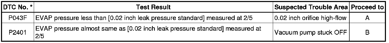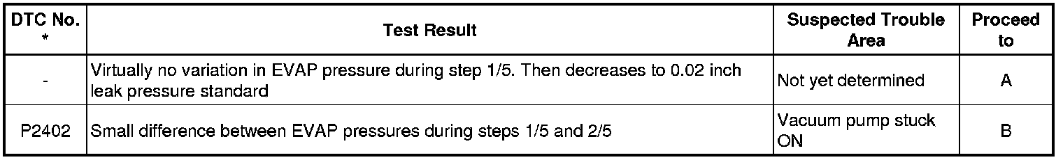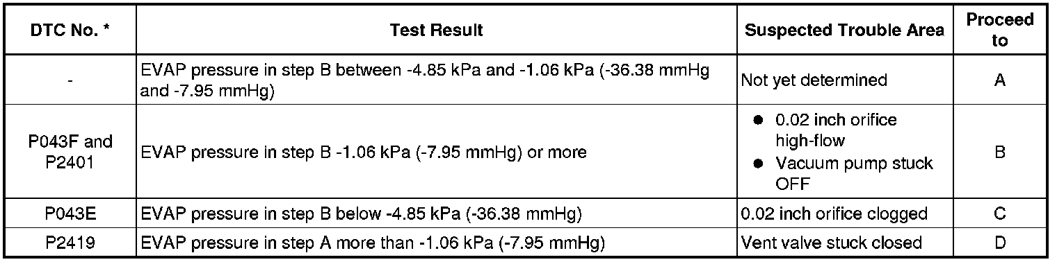 If the 0.02 inch reference pressure difference between the first and second checks is greater than the specification, the DTCs corresponding to the reference pressure (P043E, P043F, P0441, P0455, P0456, P2401 and P2420) will all be stored.