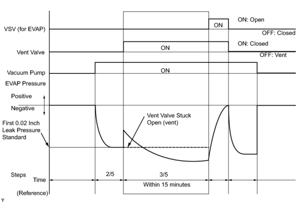* The vent valve turned OFF (open) and the EVAP pressure is then measured. If the variation in the pressure is less than 0.5 kPa (3.75 mmHg), the ECM interprets this as the EVAP VSV being stuck closed, and illuminates the MIL and sets DTC P0441 (2 trip detection logic).
