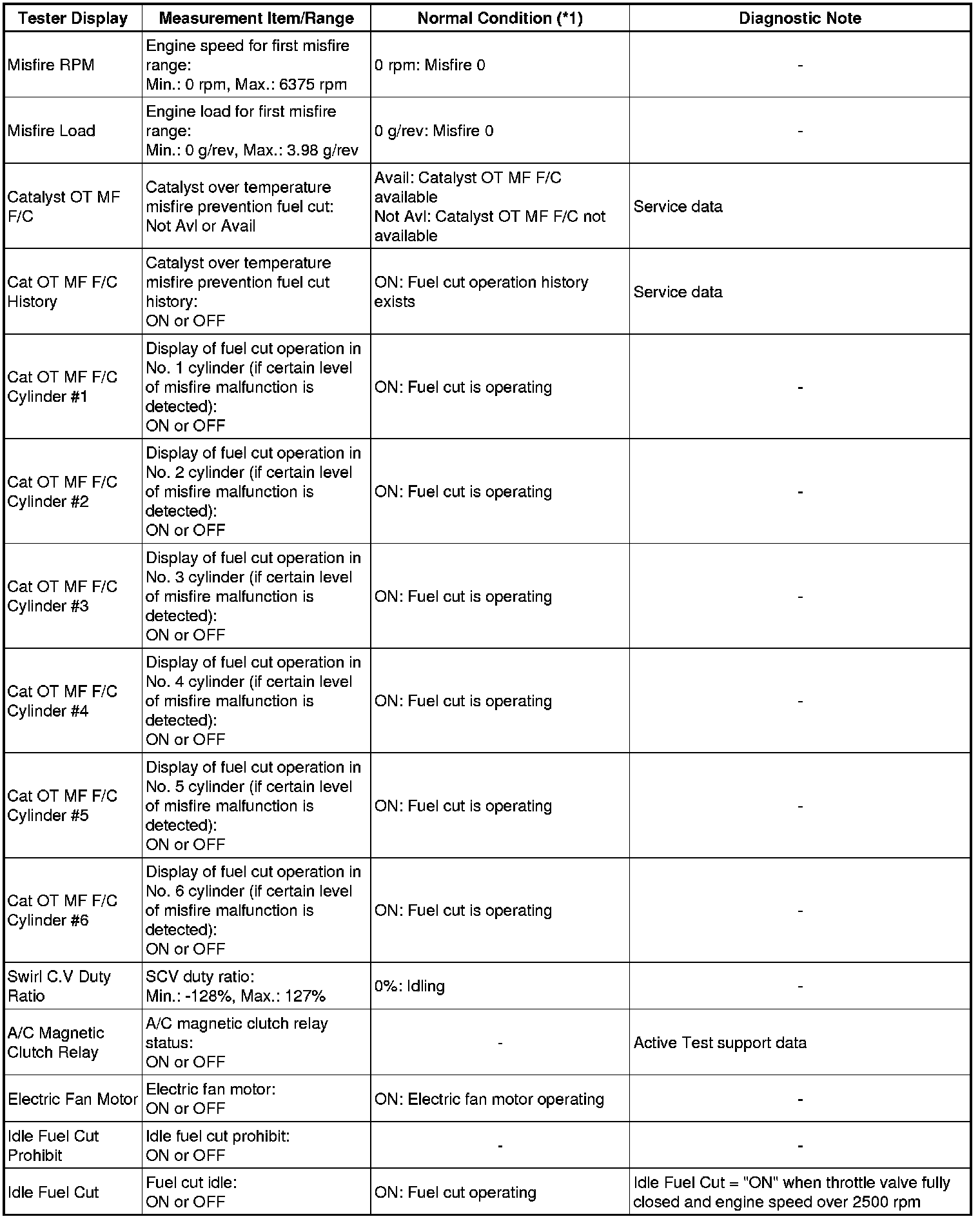 * *1: If the display of the Data List's Catalyst OT MF F/C item is Not Avl, perform this Active Test with the vehicle stopped and the engine idling. If the display of the Data List's Catalyst OT MF F/C item is Avail, perform this Active Test as described below.