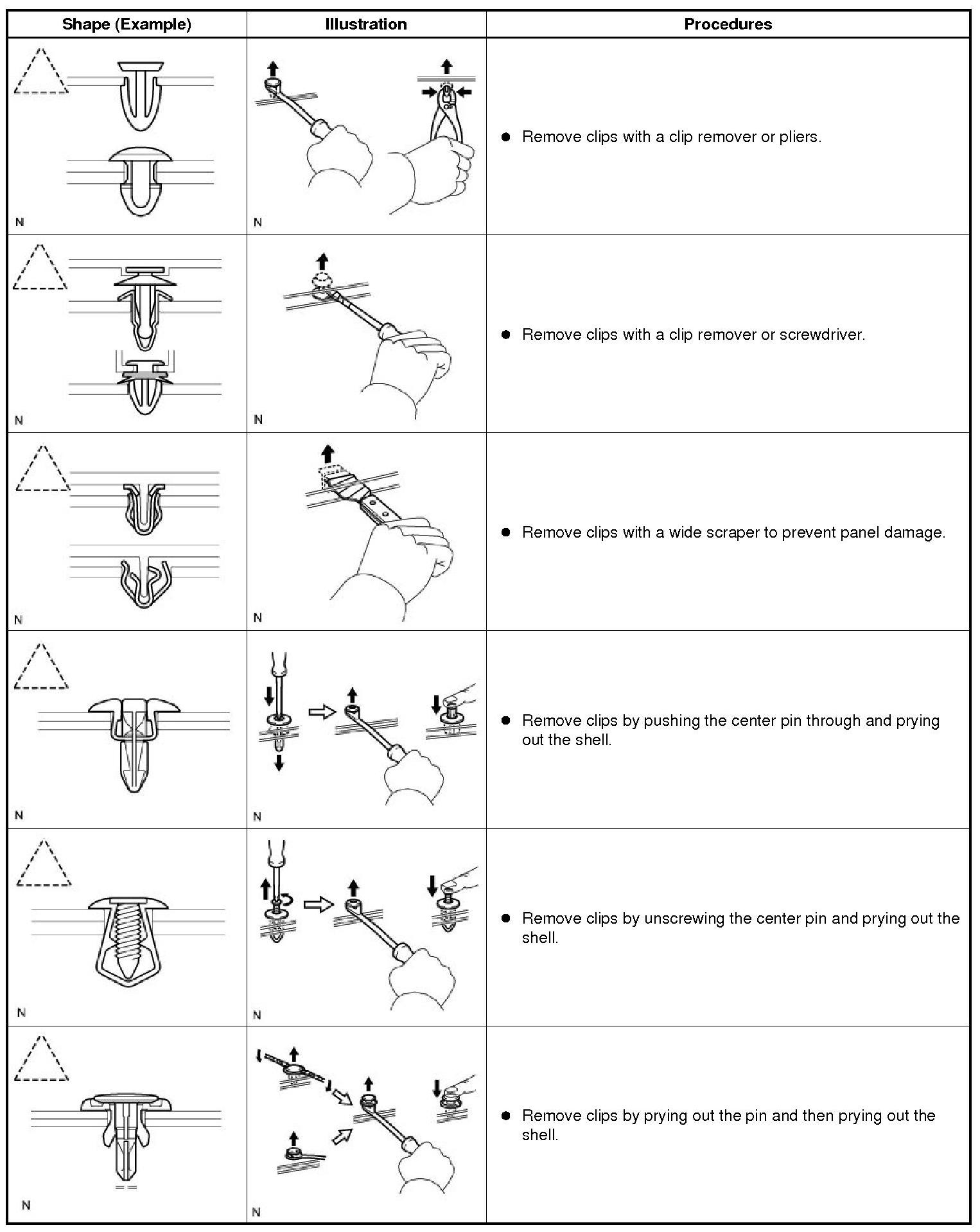 (1) The removal and installation methods of typical clips used for vehicle body parts are shown in the table below.