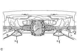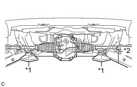 (b) Support the rear differential carrier and rear drive shaft assemblies using a jack and 2 attachments as shown in the illustration.