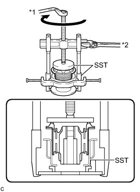 (c) Using SST, install the rear suspension member rear body mounting cushion until there is no clearance between the suspension member sub-assembly and rear suspension member rear body mounting cushion.