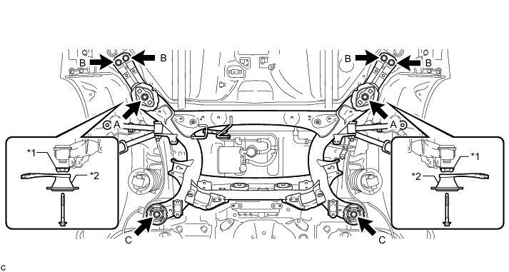 (a) Temporarily install the rear No. 2 suspension arm assembly RH to the rear suspension member sub-assembly with the bolt, nut (C) and washer.