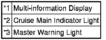 (a) The diagnosis function makes the master warning light and the multi-information display come on, and the cruise main indicator light blinks as shown in the illustration. When a malfunction occurs in the dynamic radar cruise control system, the DTCs are stored in the ECM.