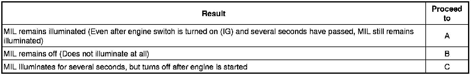 The MIL operation can be checked visually. When the engine switch is first turned on (IG), the MIL should be illuminated and should then turn off. If the MIL remains illuminated or is not illuminated, conduct the following troubleshooting procedure. If the ECM detects any trouble, the MIL illuminates. At this time, the ECM records a DTC in the memory.