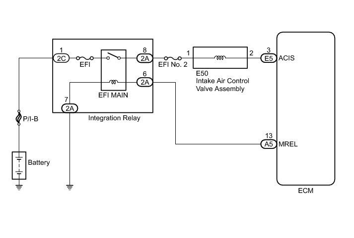 When the Intake Air Control Valve (IACV) opens and closes, the Acoustic Control Induction System (ACIS) control circuit causes the engine load intake efficiency to increase. When the engine is running at 2200 to 4300 rpm and the throttle valve opening angle is 30° or more, current flows through the ACIS control circuit and the intake air control valve closes. For all other situations, current does not flow through the ECM and the intake air control valve is open.