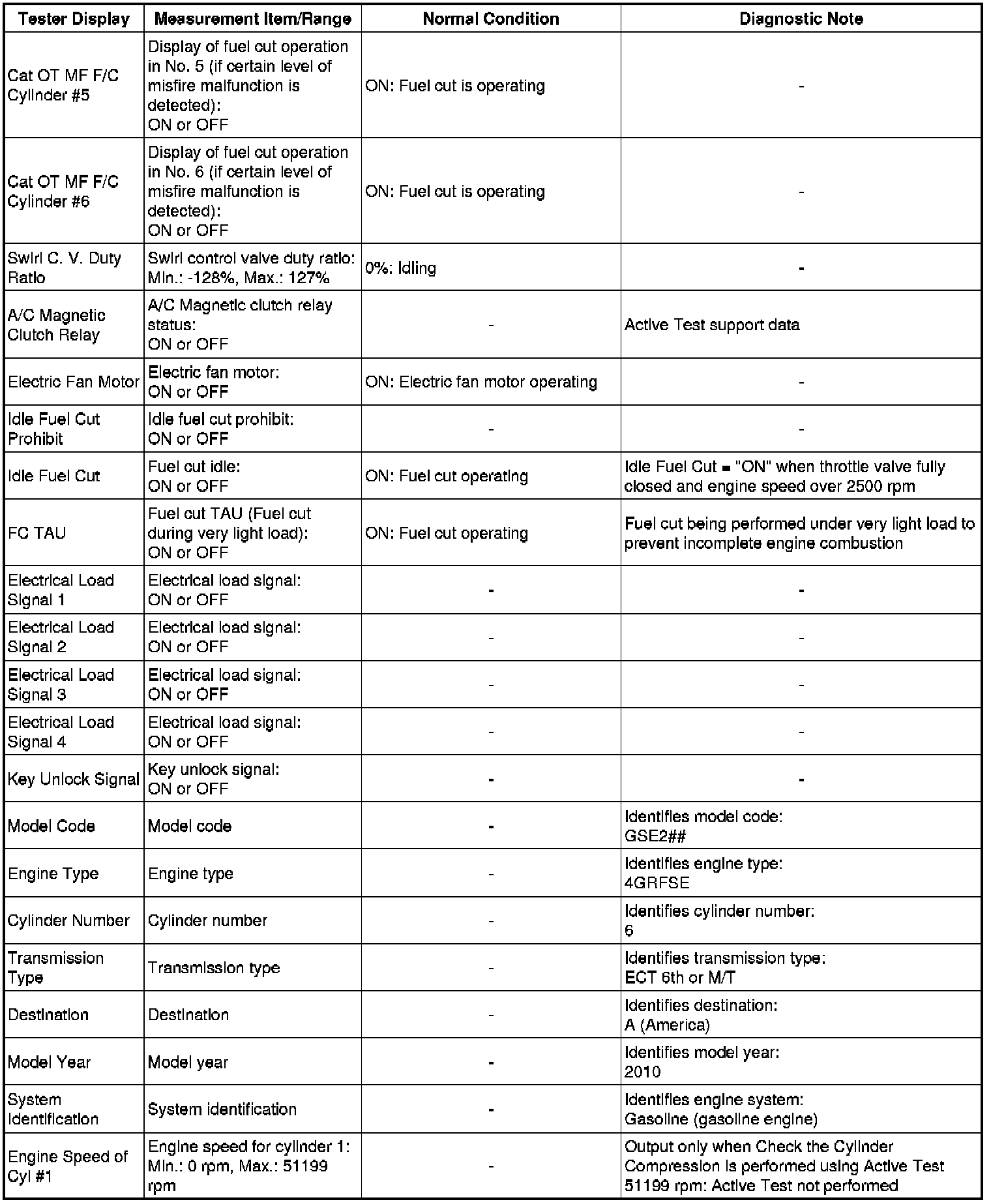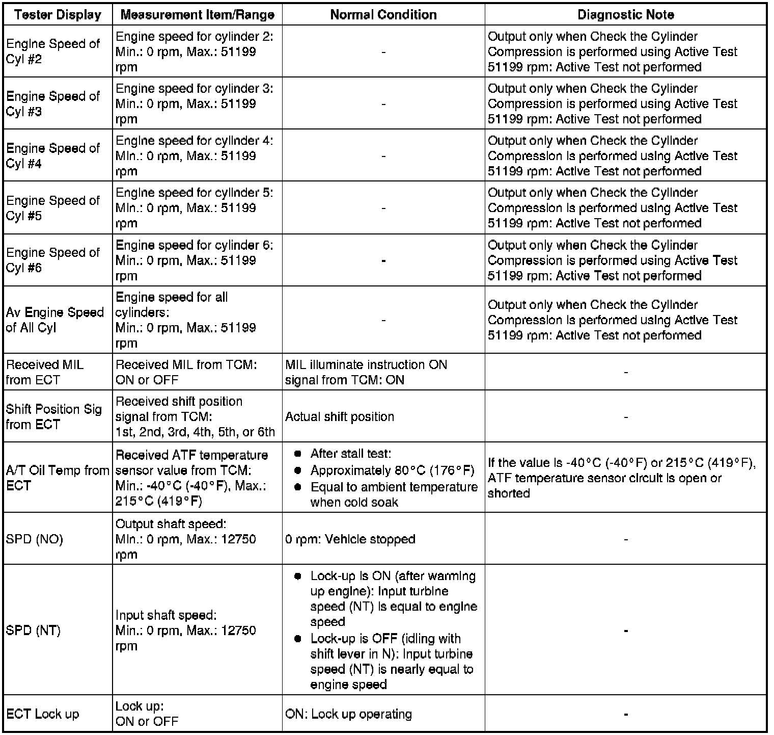 *2: While the Active Test item Check the Cylinder Compression is being performed, the fuel and ignition of all cylinders is cut. At this time, the ECM measures the speed of each cylinder while the engine is being cranked.