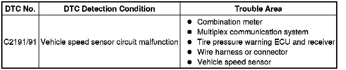 TIRE PRESSURE MONITORING: TIRE PRESSURE WARNING SYSTEM: C2191/91: Vehicle Speed Signal Error (Test Mode DTC)
