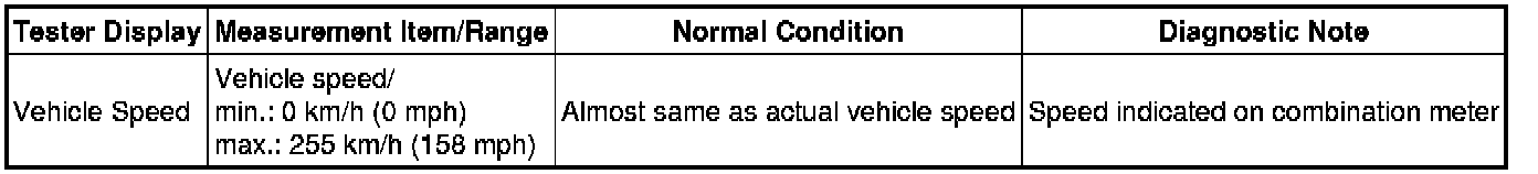 The tire pressure warning ECU and receiver receives a speed signal from the combination meter. This DTC is stored upon entering the test mode, and cleared when a vehicle speed signal of 20 km/h (12 mph) is detected for 3 seconds or more. The DTC is output only in the test mode.