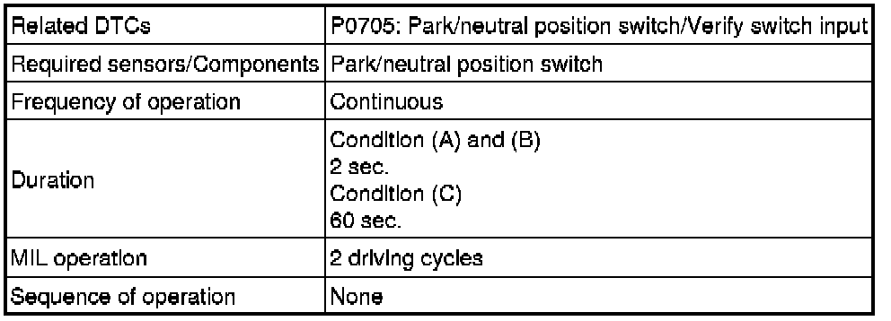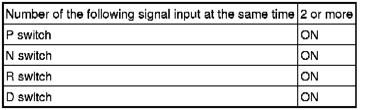 The park/neutral position switch sends a signal to the ECM according to the shift position (P, R, N, D, or S). The ECM determines that there is a problem with the switch or related parts if it receives more than 1 position signal simultaneously. The ECM will turn on the MIL and store the DTC.
