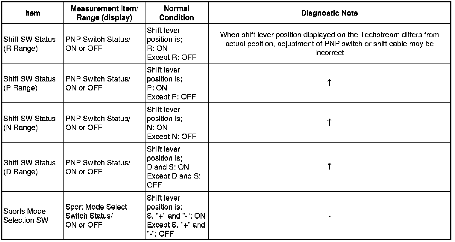 Using the Techstream to read the Data List allows the values or states of switches, sensors, actuators and other items to be read without removing any parts. This non-intrusive inspection can be very useful because intermittent conditions or signals may be discovered before parts or wiring is disturbed. Reading the Data List information early in troubleshooting is one way to save diagnostic time.