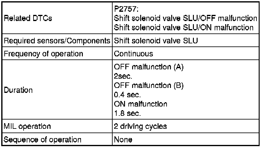 If the ECM detects no lock-up after lock-up has been requested or if it detects lock-up when it is not requested, the ECM interprets this as a fault in the shift solenoid valve SLU or lock-up system performance.