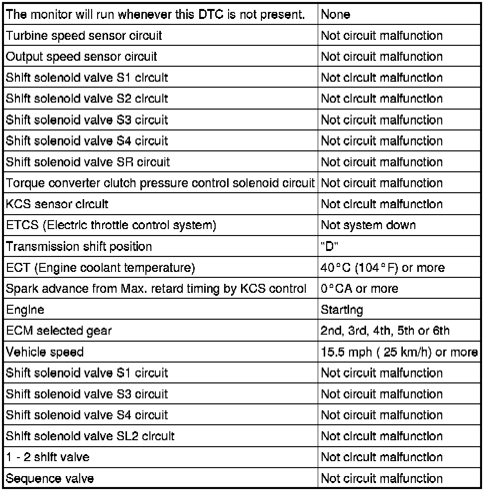 Then the ECM compares the engagement condition of the lock-up clutch with the lock-up schedule in the ECM memory to detect a mechanical problems of the shift solenoid valve SLU, valve body and torque converter clutch.