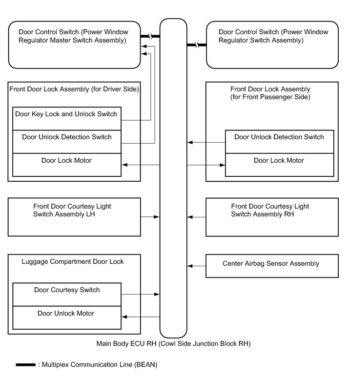 * The driver and front passenger side door control switches send lock/unlock request signals to the main body ECU RH (cowl side junction block RH) by multiplex communication (BEAN). Then, the main body ECU RH (cowl side junction block RH) sends these request signals to the door lock motors in each door to lock/unlock all doors at once in response to the inputs.