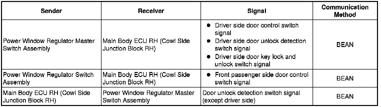 * The driver door key cylinder lock/unlock request signals are sent to the power window regulator master switch assembly. Then, the power window regulator master switch assembly sends these request signals to the main body ECU RH (cowl side junction block RH) by multiplex communication (BEAN).
