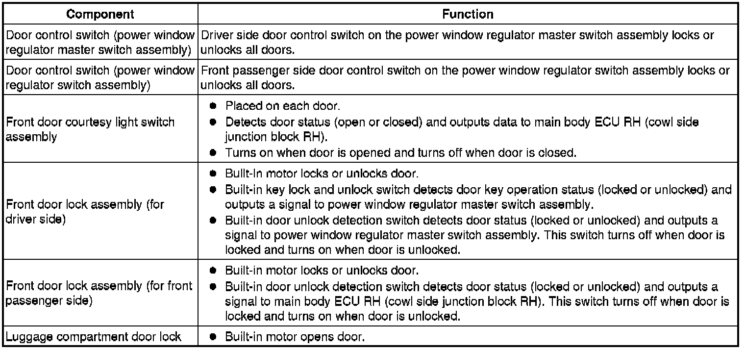 (a) This system is controlled by the main body ECU RH (cowl side junction block RH). The main body ECU RH (cowl side junction block RH) outputs signals to each door lock motor. The power door lock control system has the following functions: