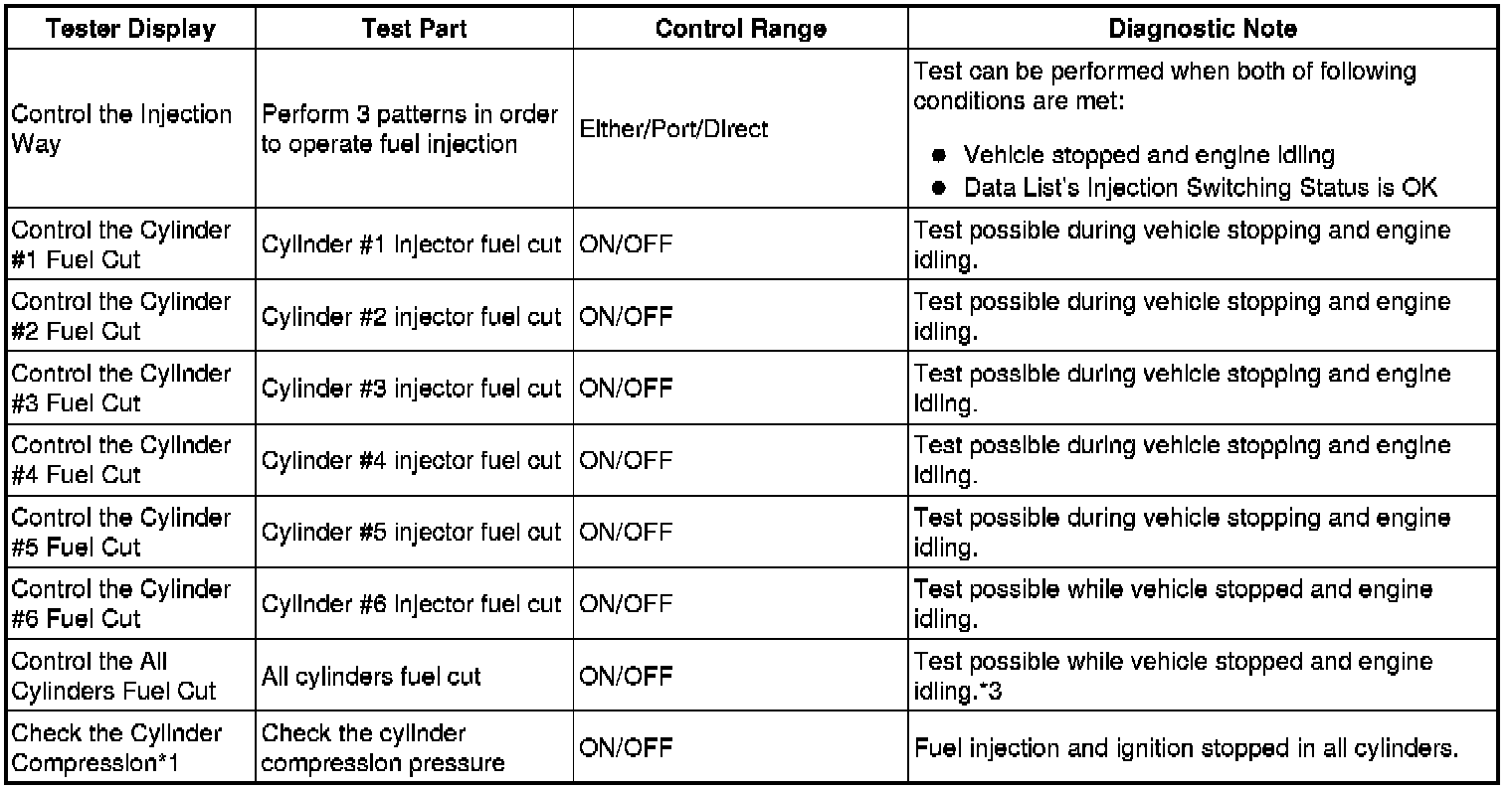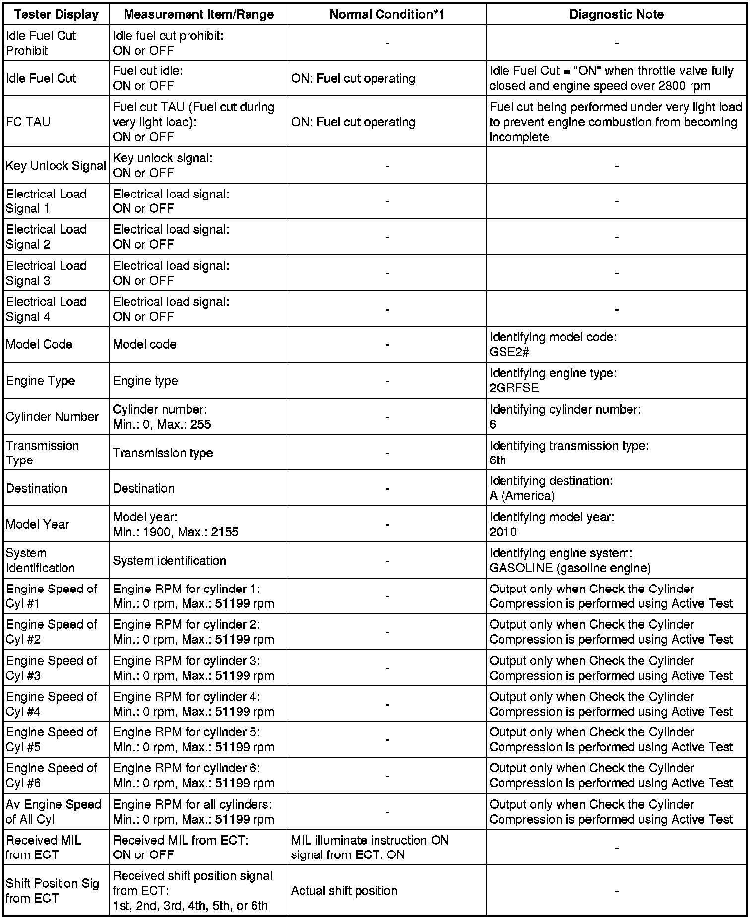 *1: When cranking the engine, each cylinder measures the engine rpm. In this Active Test, the fuel and ignition of all cylinders are cut, and cranking occurs for approximately 10 seconds. Then, each cylinder measures the engine rpm. If a cylinder's engine rpm is higher than the others, that cylinder's compression pressure is compared to the others, and is determined whether it is low or not.