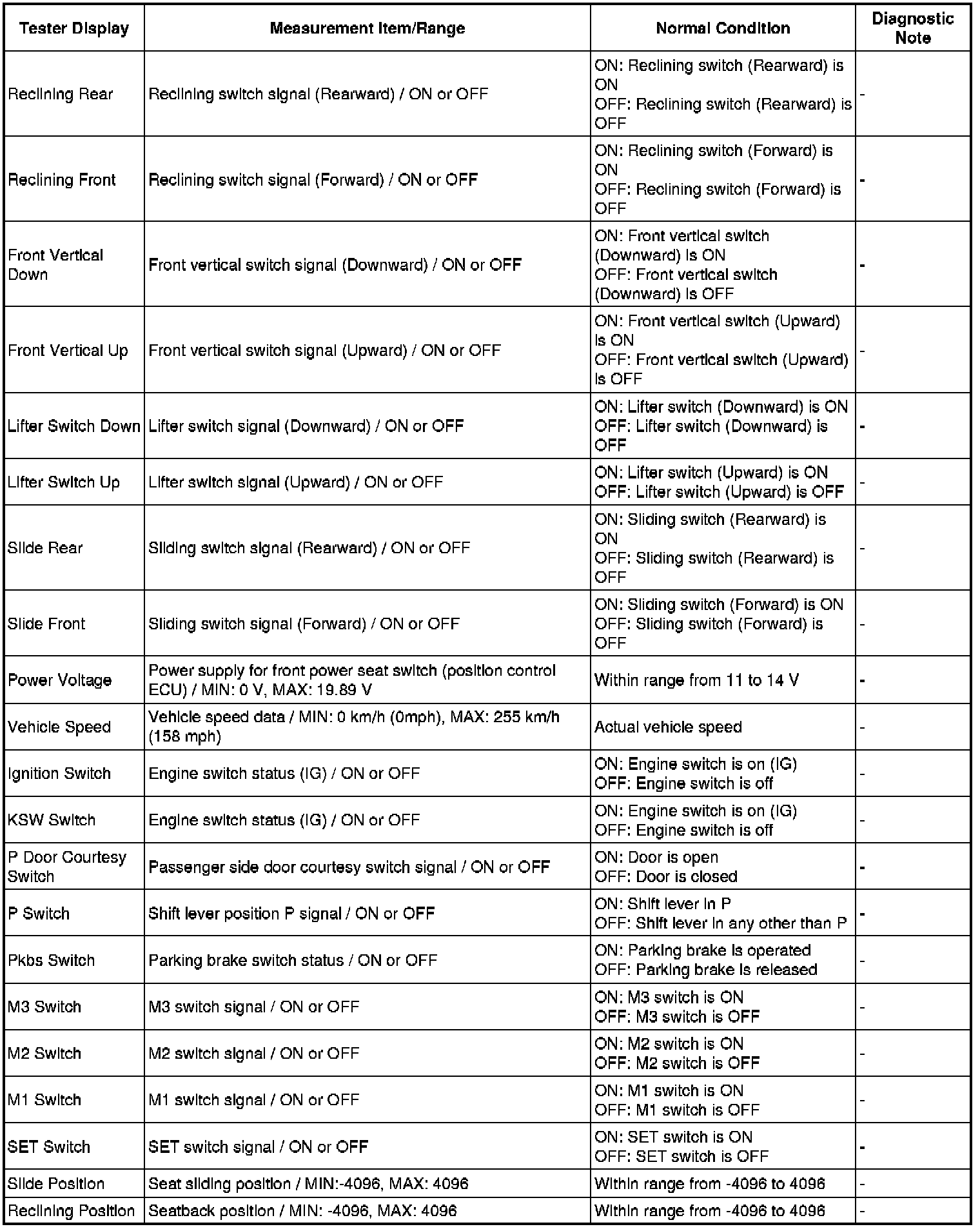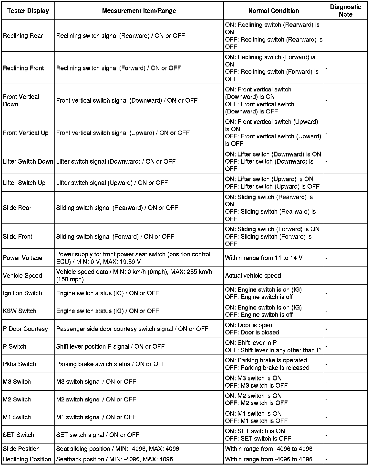 SEAT: FRONT POWER SEAT CONTROL SYSTEM: DATA LIST / ACTIVE TEST