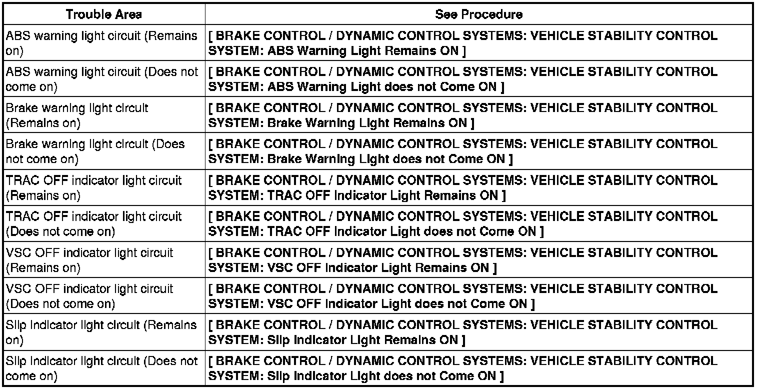 * If any of the indicators remain on or do not come on, proceed to troubleshooting for the light circuits listed below.