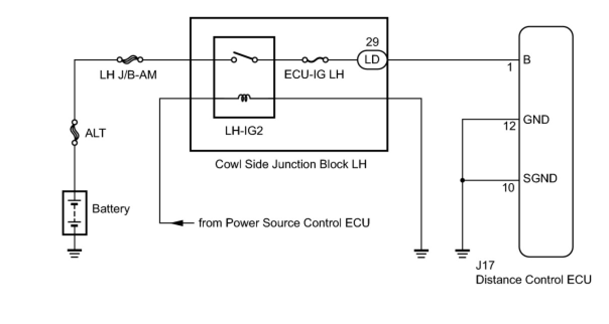 This circuit provides power to operate the distance control ECU. The distance control ECU determines information about the vehicle in front based on data from the radar sensor, and then decides how much acceleration and/or deceleration is needed to maintain the set distance. The distance control ECU also requests the skid control ECU to apply braking and to sound the buzzer.