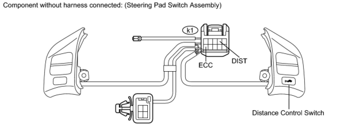 The distance control switch sets the vehicle-to-vehicle distance control mode. The distance control switch is installed in the steering pad switch. The vehicle-to-vehicle distance set value can be changed by operating the steering pad switch (distance control switch) while the dynamic radar cruise control system is in operation. The steering pad switch uses the BEAN to communicate with each ECU. Therefore, it does not have a direct connection with the ECM. If there are any malfunctions in the communication line of the steering pad switch, one or more DTCs in the multiplex communication system are output.
