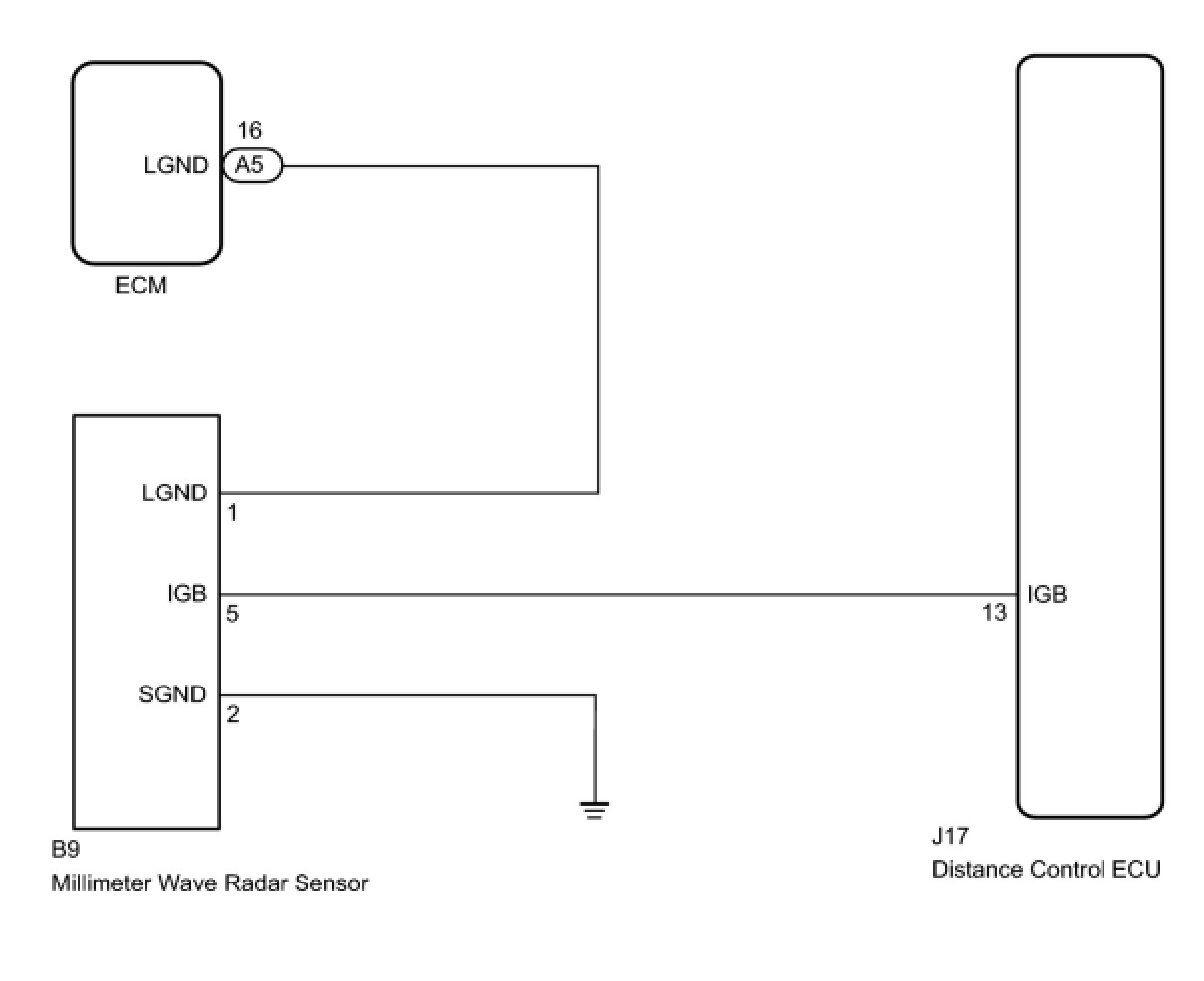 This circuit provides power to the millimeter wave radar sensor. The millimeter wave radar sensor emits radio waves towards an object in front and measures the distance and direction of the object by receiving the beam reflections. Based on the reflections, the sensor calculates the difference in speed between the vehicle and the object in front. This data is transmitted to the distance control ECU. The ECU recognizes the millimeter wave radar sensor via terminals LGND. If an open circuit occurs in the wire harness between terminals LGND, the ECM cannot recognize the millimeter wave radar sensor. The ECM will stop the control of the vehicle-to-vehicle distance control mode and only the constant speed control mode can be used.