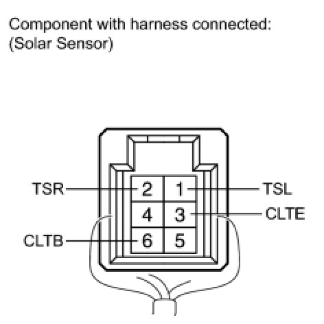 * The connection procedure for using a digital tester such as a TOYOTA electrical tester is shown above. When using an analog tester, connect the negative (-) lead to terminal 1*1, 2*2 and positive (+) lead to terminal 6 of the solar sensor.