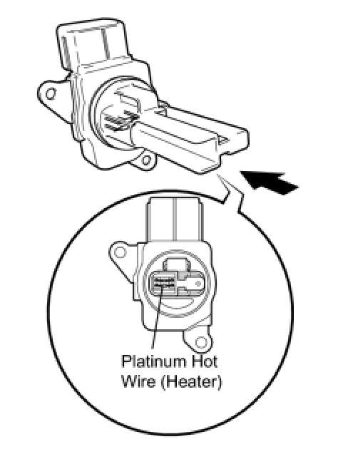 (a) Perform a visual check for any foreign matter on the platinum hot wire (heater) of the mass air flow meter shown in the illustration.