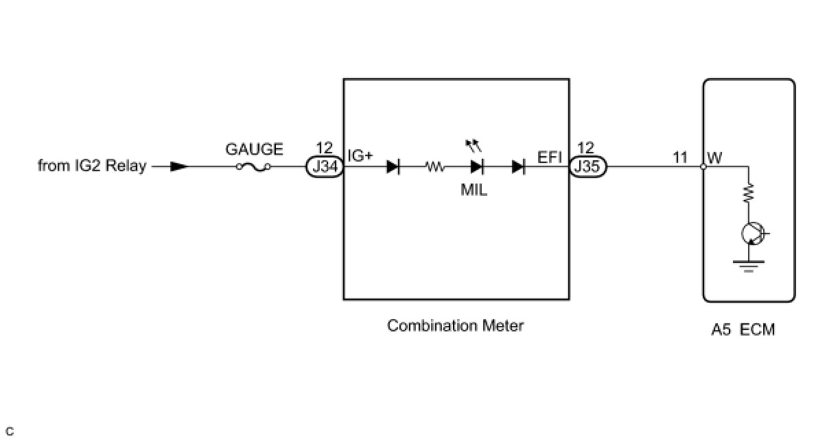 The MIL (Malfunction Indicator Lamp) is used to indicate vehicle malfunction detections by the ECM. By turning the engine switch on (IG), power is supplied to the MIL circuit, and the ECM provides the circuit ground which illuminates the MIL.