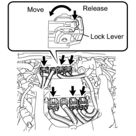 (1) Disconnect the 6 connectors with wire harness locks and the 2 connectors without wire harness locks from the 2 injector drivers.