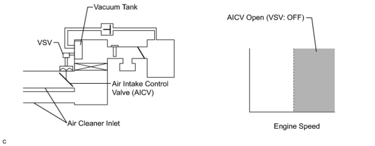 When the engine is operating in the low-to-mid speed range, this control operates the AICV to close one of the air cleaner inlets. When the engine speed is more than 3600 rpm the ECM turns off the VSV to open the AICV.