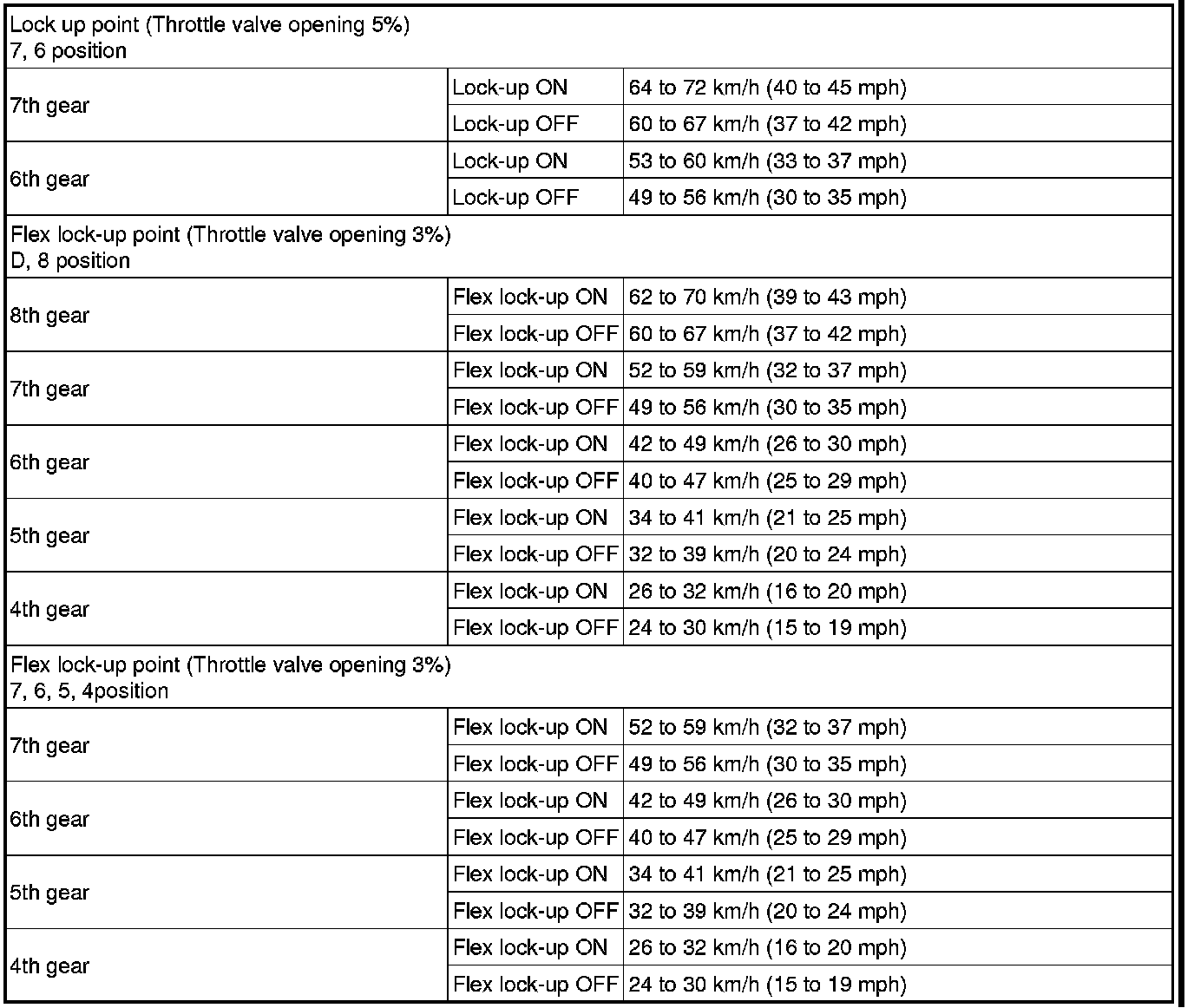 * All shift point values indicated in the above tables are actual values. Therefore, if checking a shift point with a chassis dynamometer, keep in mind that there is a range of error in the chassis dynamometer indication.
