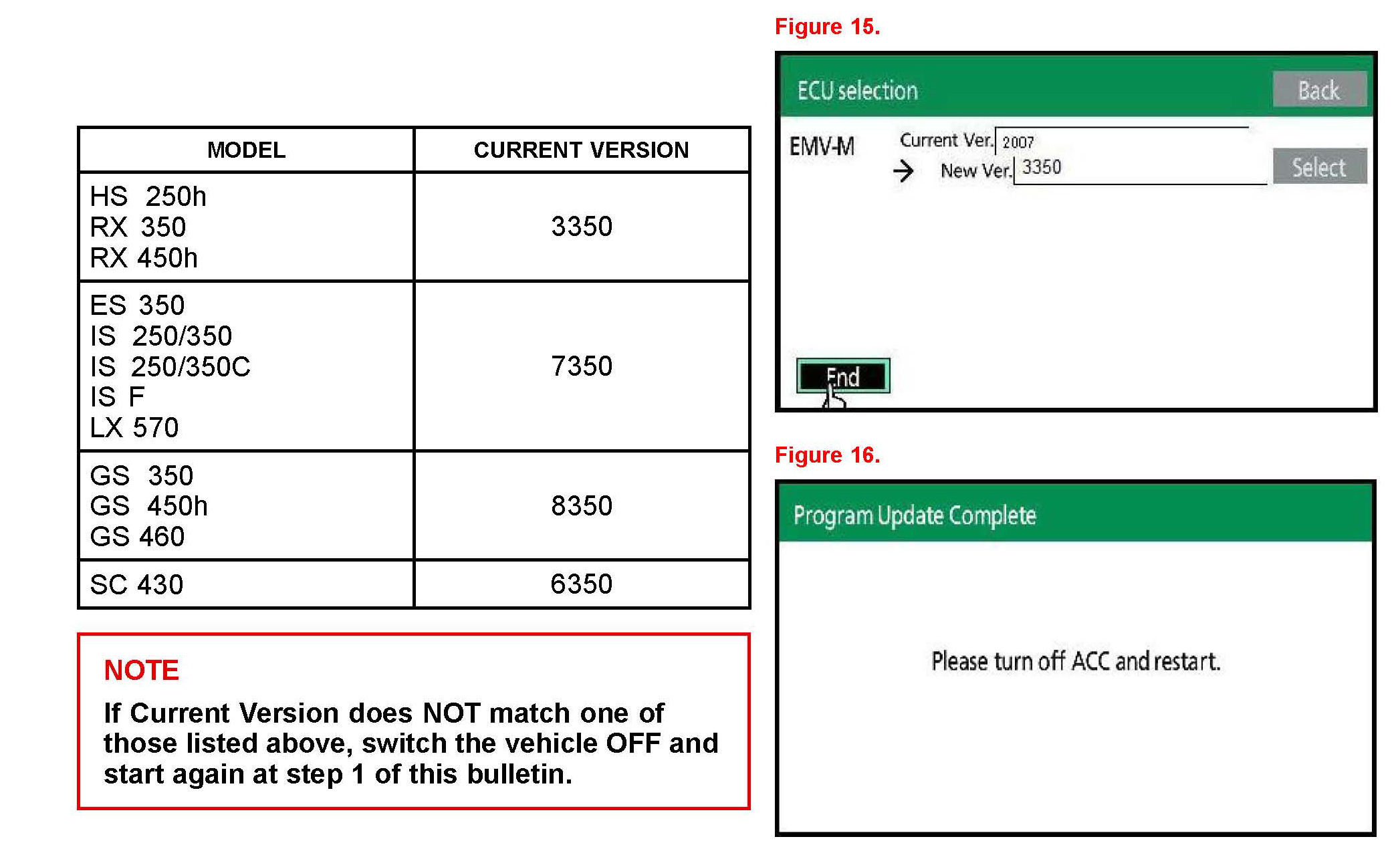 8. When the ECU Selection screen appears, confirm the Current version is less than the New version. If yes, then click the Select button. If no, then click End and go to step 11.