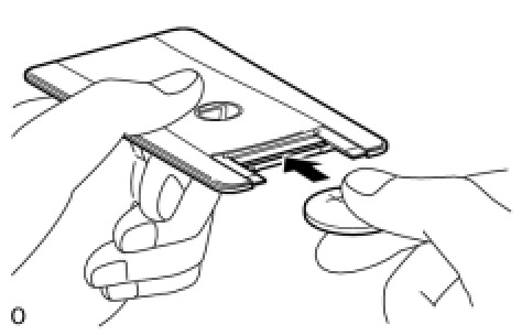 (a) Push in and install the transmitter battery (lithium battery (CR2412)) while being careful of the following: 1) the positive (+) and negative (-) terminals of the battery; and 2) being sure to insert the battery between the 2 terminals and deep into the card, in the direction of the arrow.