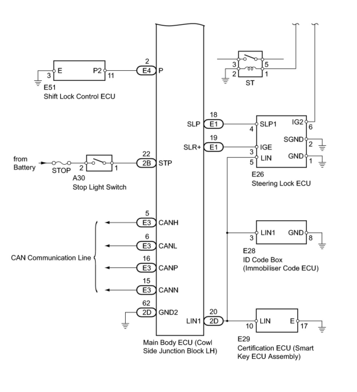 (d) The certification ECU (smart key ECU assembly) outputs a steering unlock signal. The signal is sent to the steering lock ECU via the LIN communication line.