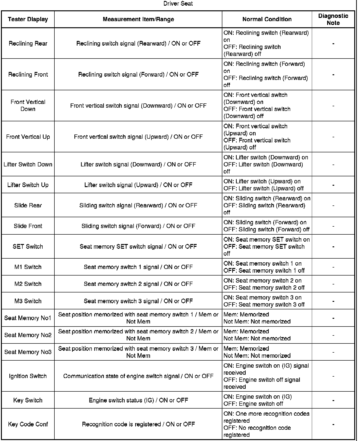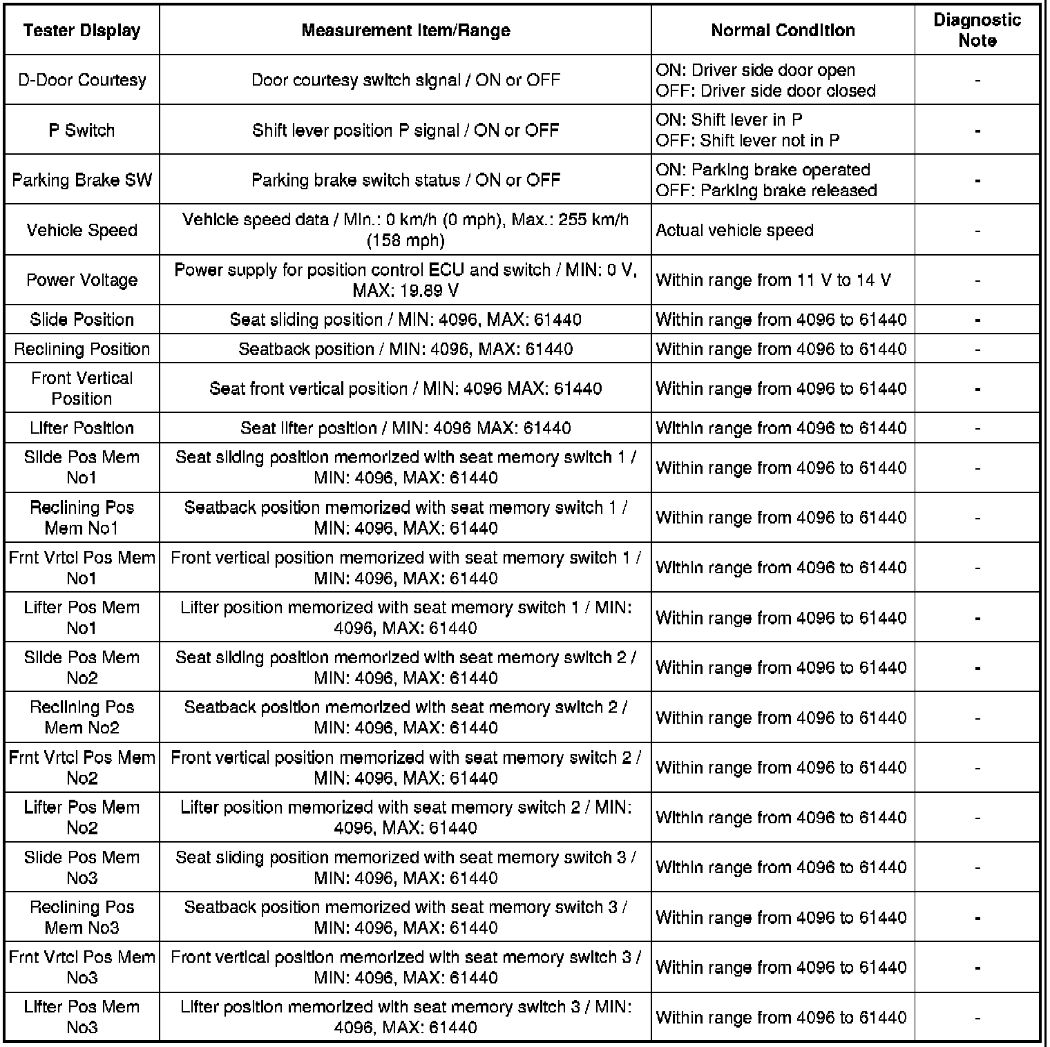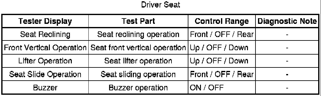 SEAT: FRONT POWER SEAT CONTROL SYSTEM: DATA LIST / ACTIVE TEST