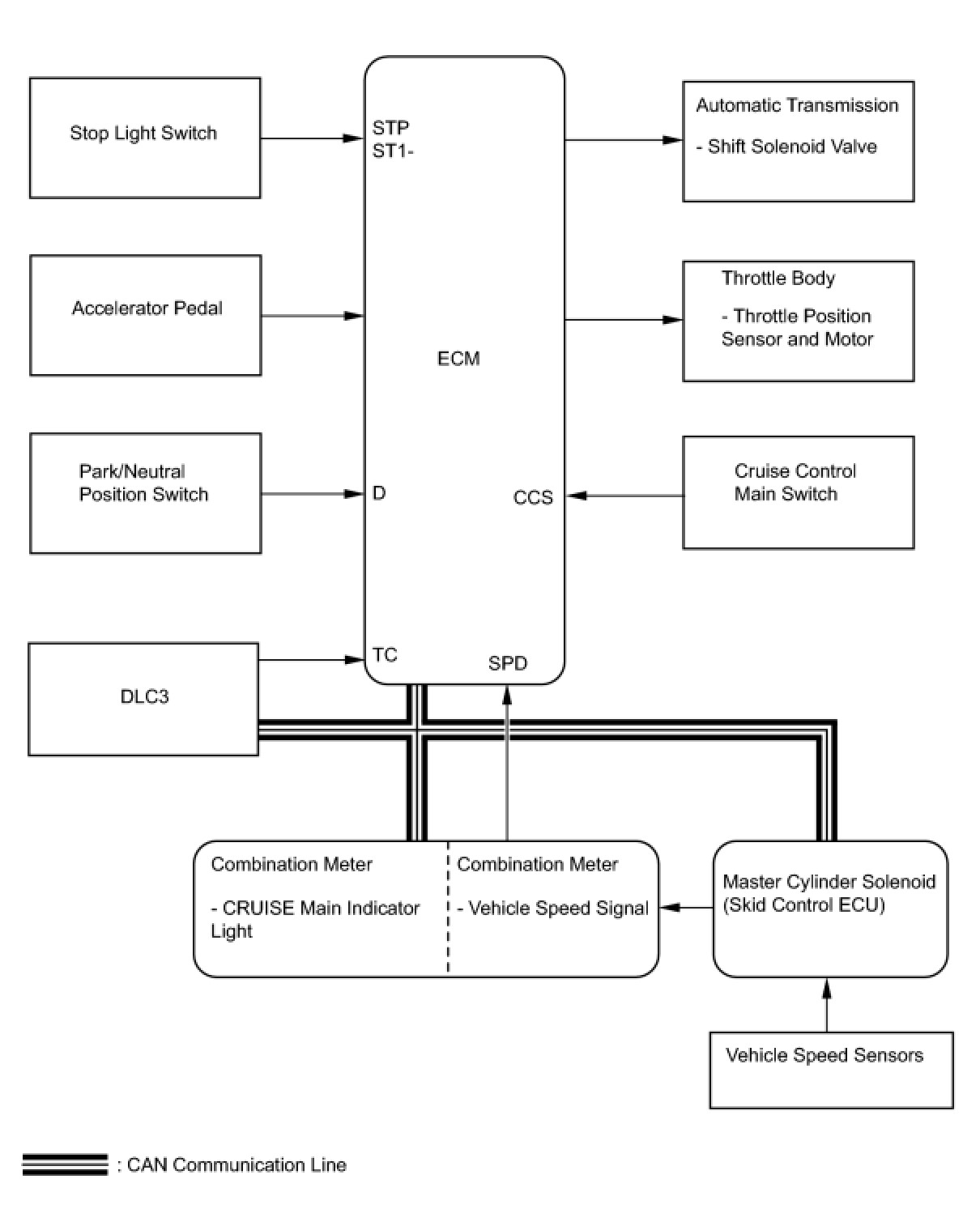 * The ECM receives signals such as ON-OFF, -SET (COAST/SET), +RES (ACCELERATION/RESUME), and CANCEL from the cruise control main switch and executes the corresponding function.