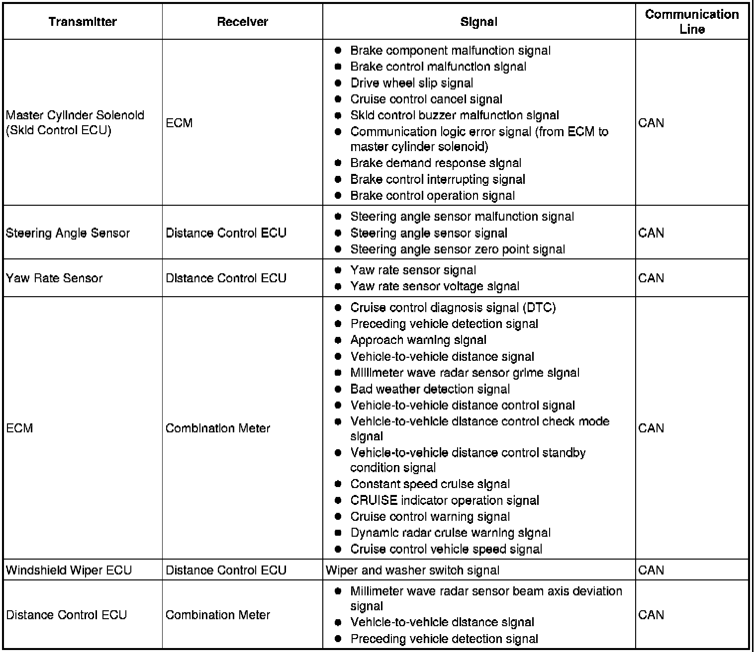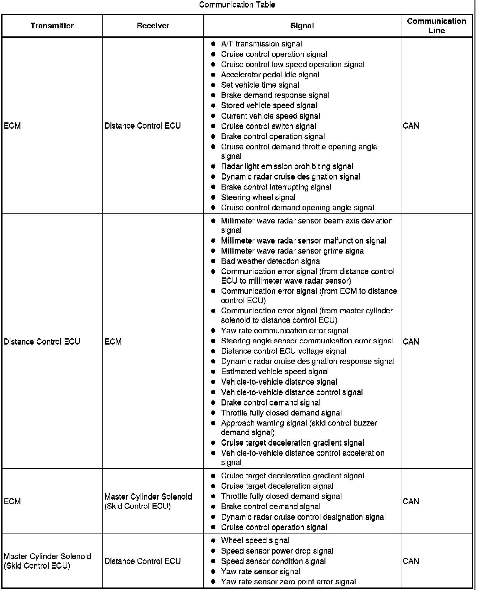 The distance control ECU determines the distance to the vehicle in front, relative speed, target decreasing speed and deceleration rate. Based on the data, the ECU may transmit a brake demand signal to the master cylinder solenoid (skid control ECU) via the ECM.