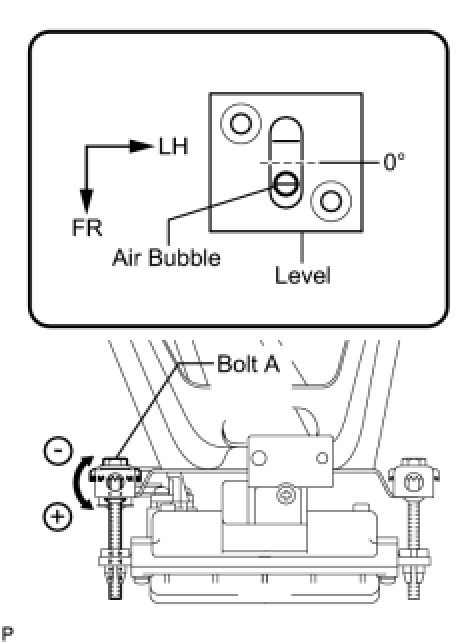 (3) Using a screwdriver, adjust the sensor by turning the vertical adjusting bolt of the millimeter wave radar sensor assembly (bolt A) until the air bubble is centered on the red line of the level as shown in the illustration.