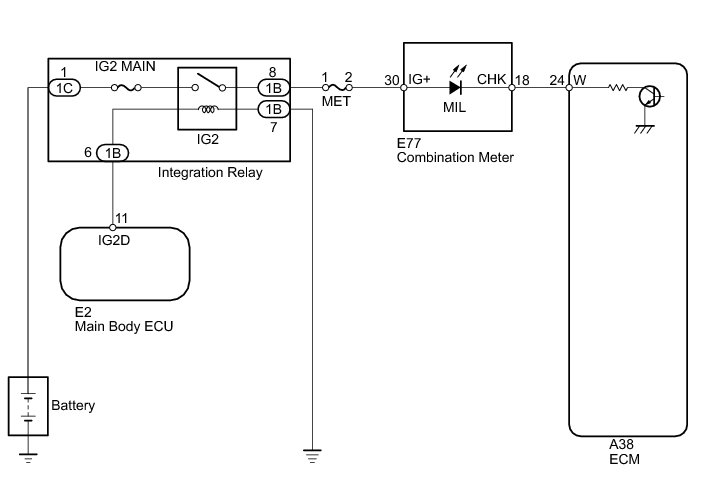 The MIL (Malfunction Indicator Lamp) is used to indicate vehicle malfunction detections by the ECM. When the engine switch is turned on (IG), power is supplied to the MIL circuit, and the ECM provides the circuit ground which illuminates the MIL.