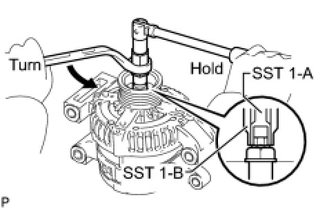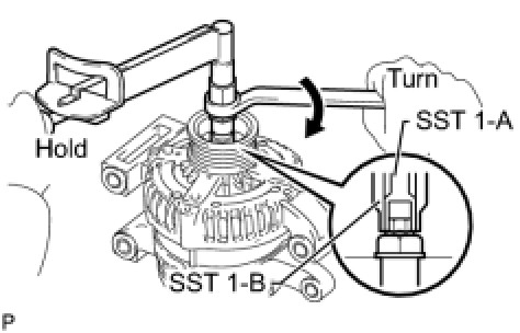 (e) Tighten the pulley nut by turning SST 1-A in the direction shown in the illustration.