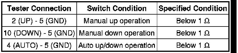 * If the result is not as specified, replace the power window regulator switch assembly.