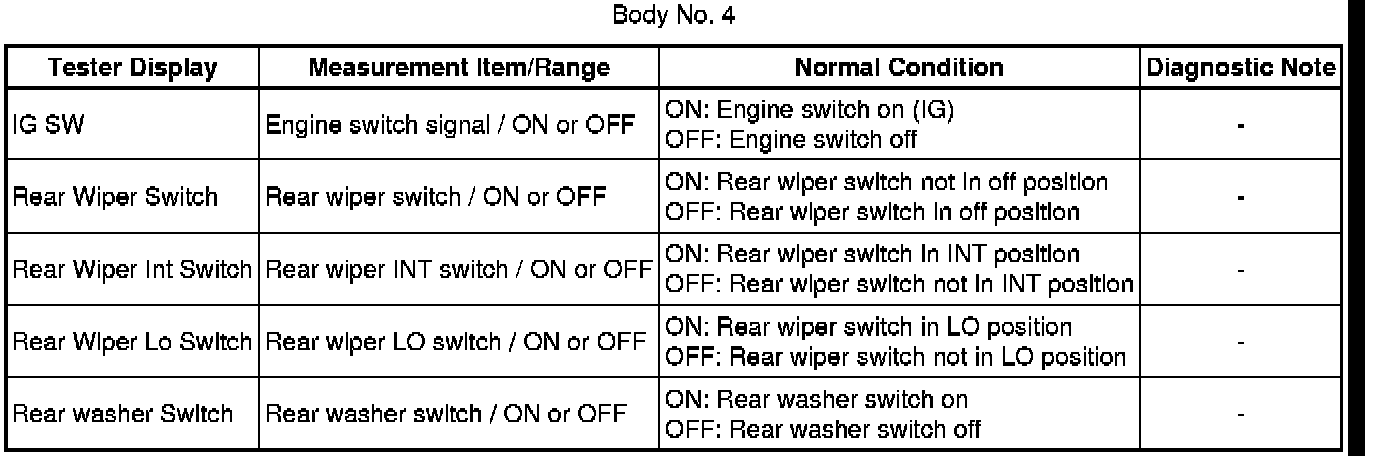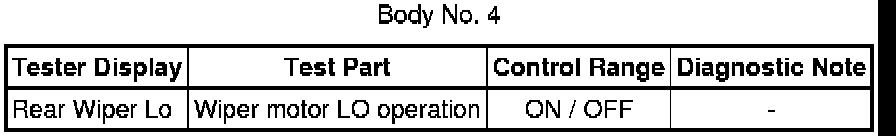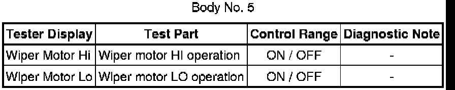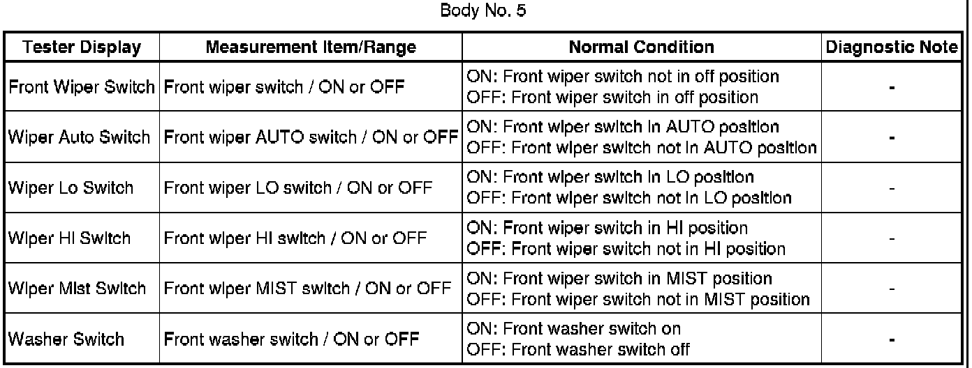 When a Body No. 5 (windshield wiper ECU) related front wiper switch is on, Active Test items related to the front wiper switch are prohibited (double operation prohibition). Check that the front wiper switches are off before performing Active Tests.