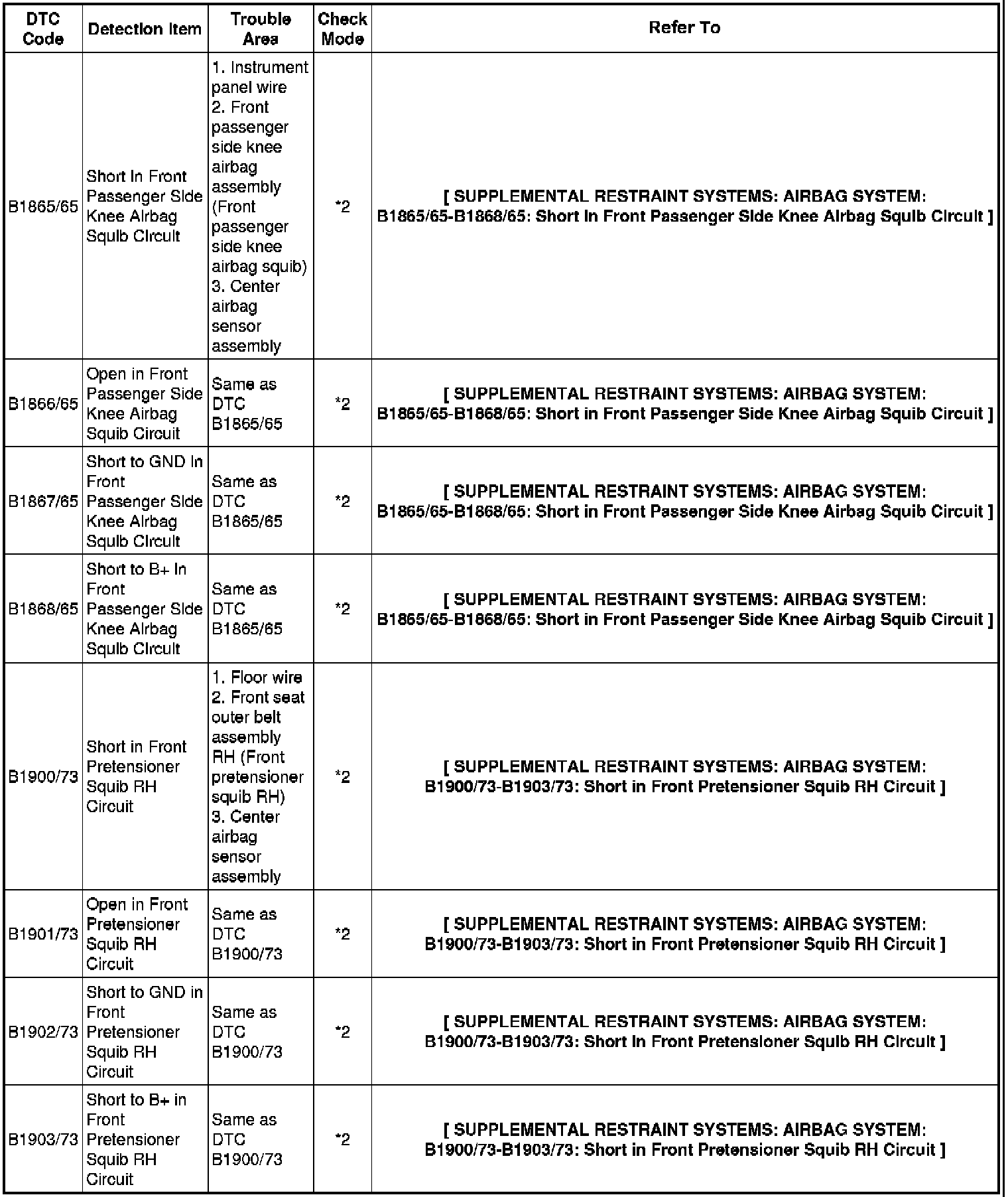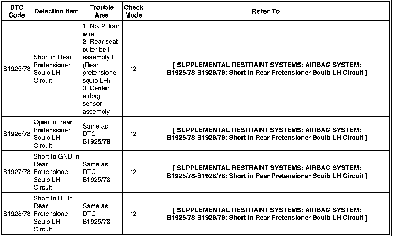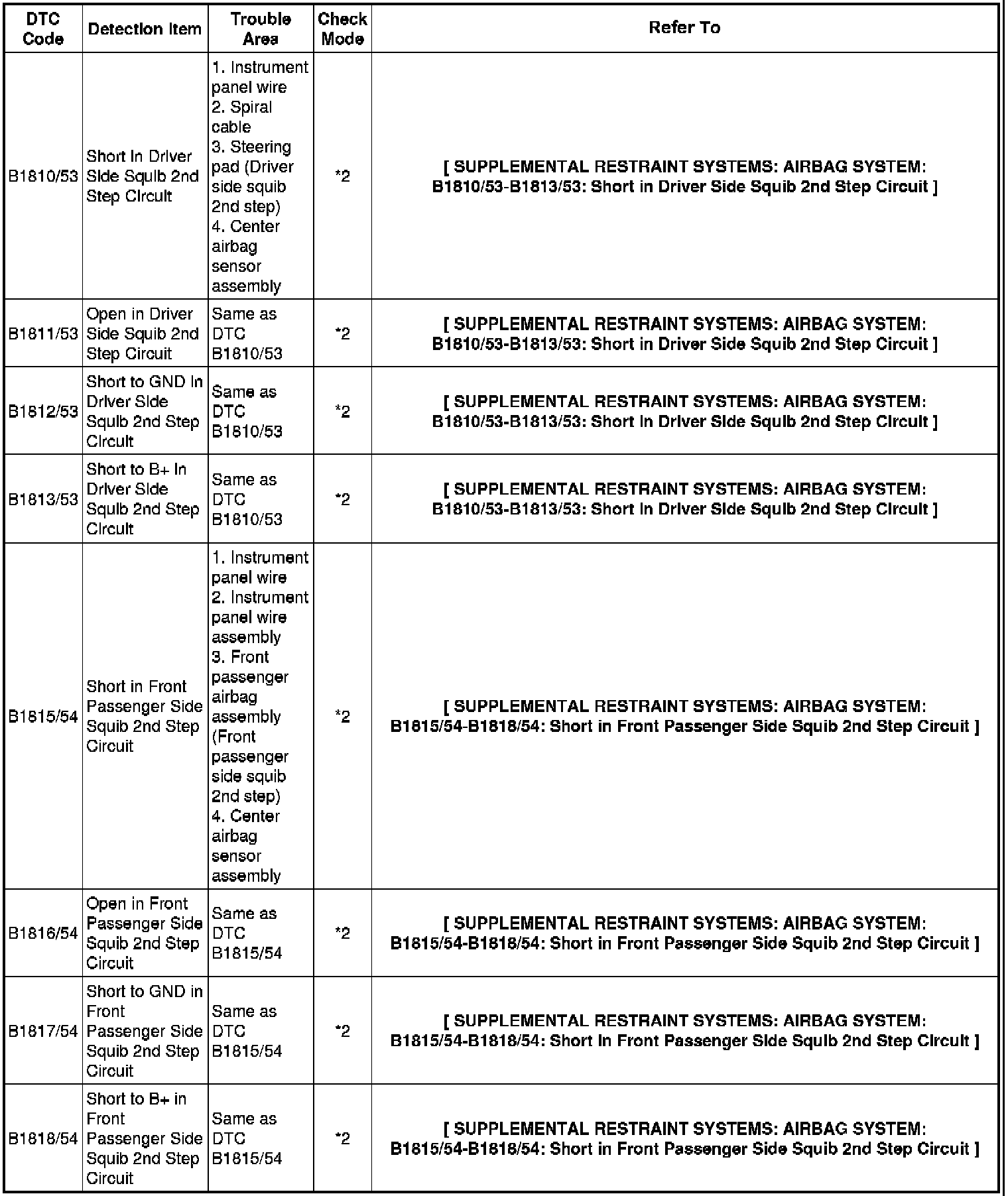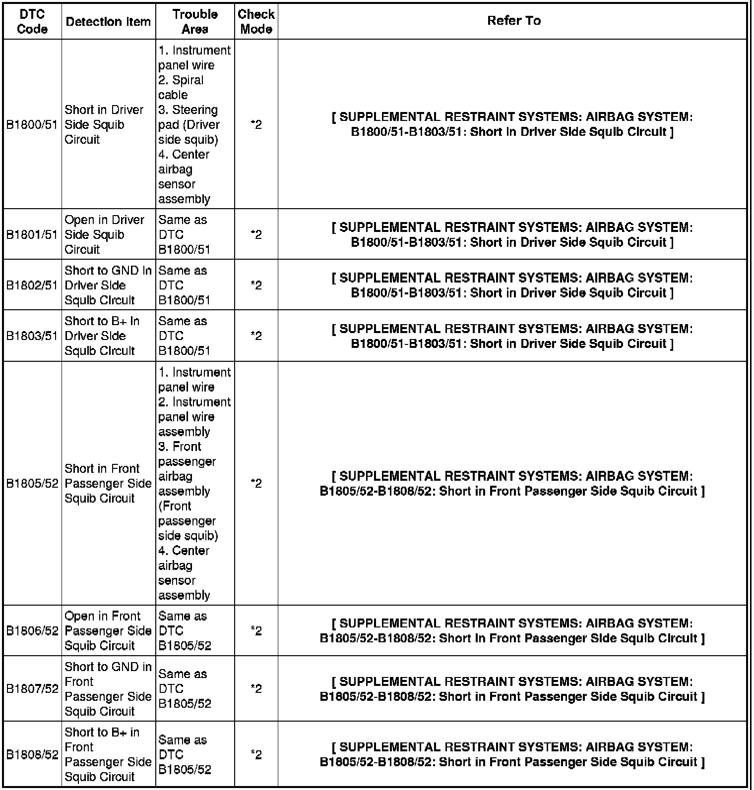 * In the case of any malfunction concerning an open circuit, short to ground, or short to B+ due to a squib, other trouble codes may not be detected. In this case, repair the malfunction currently indicated and then perform malfunction diagnosis again.
