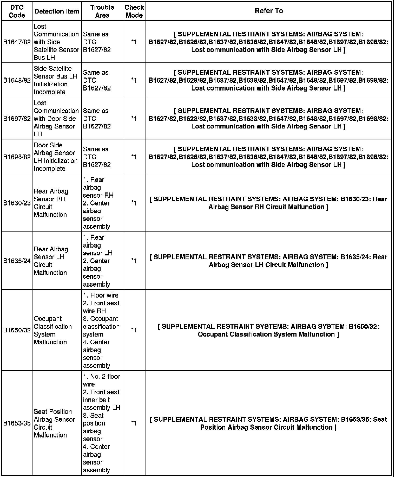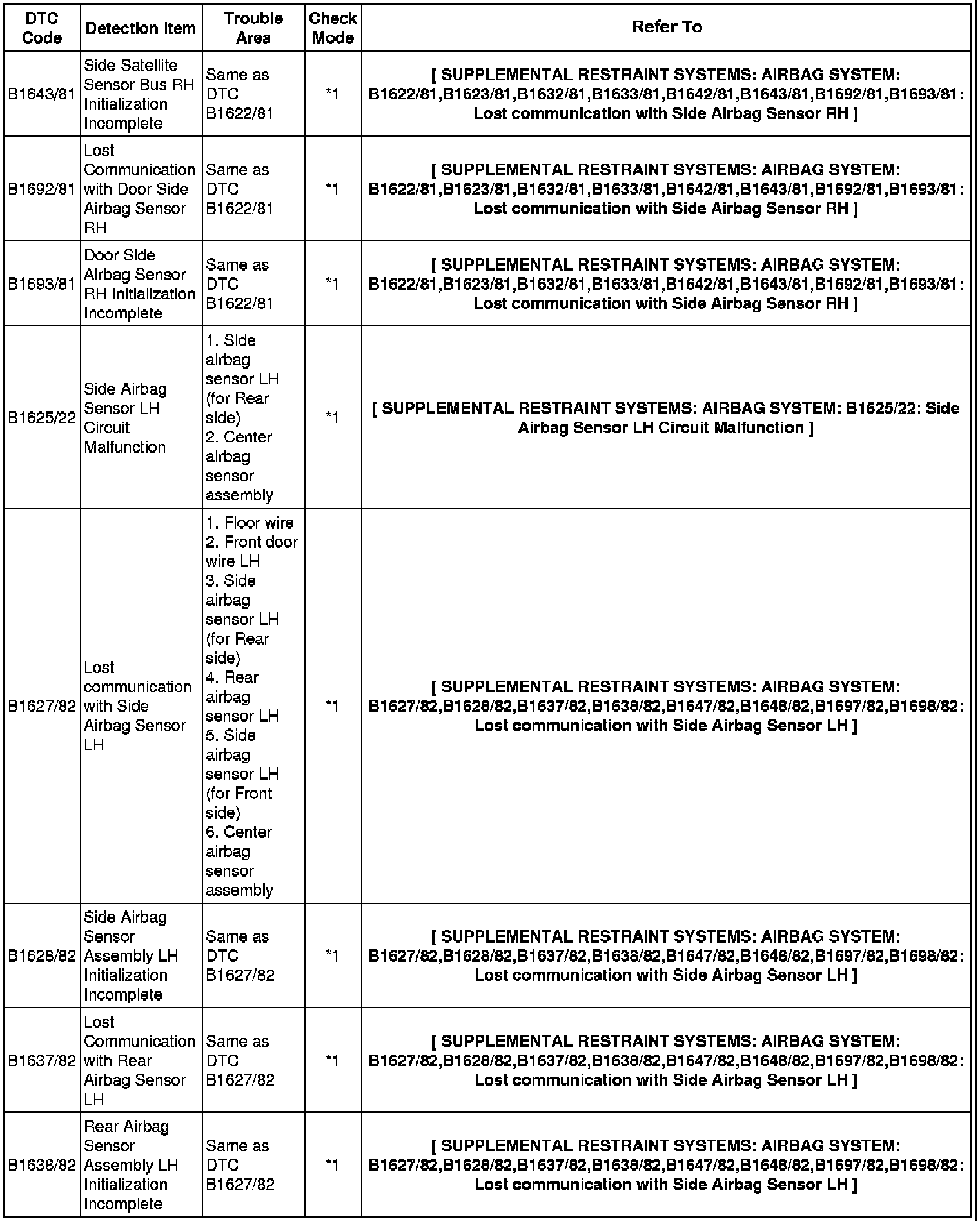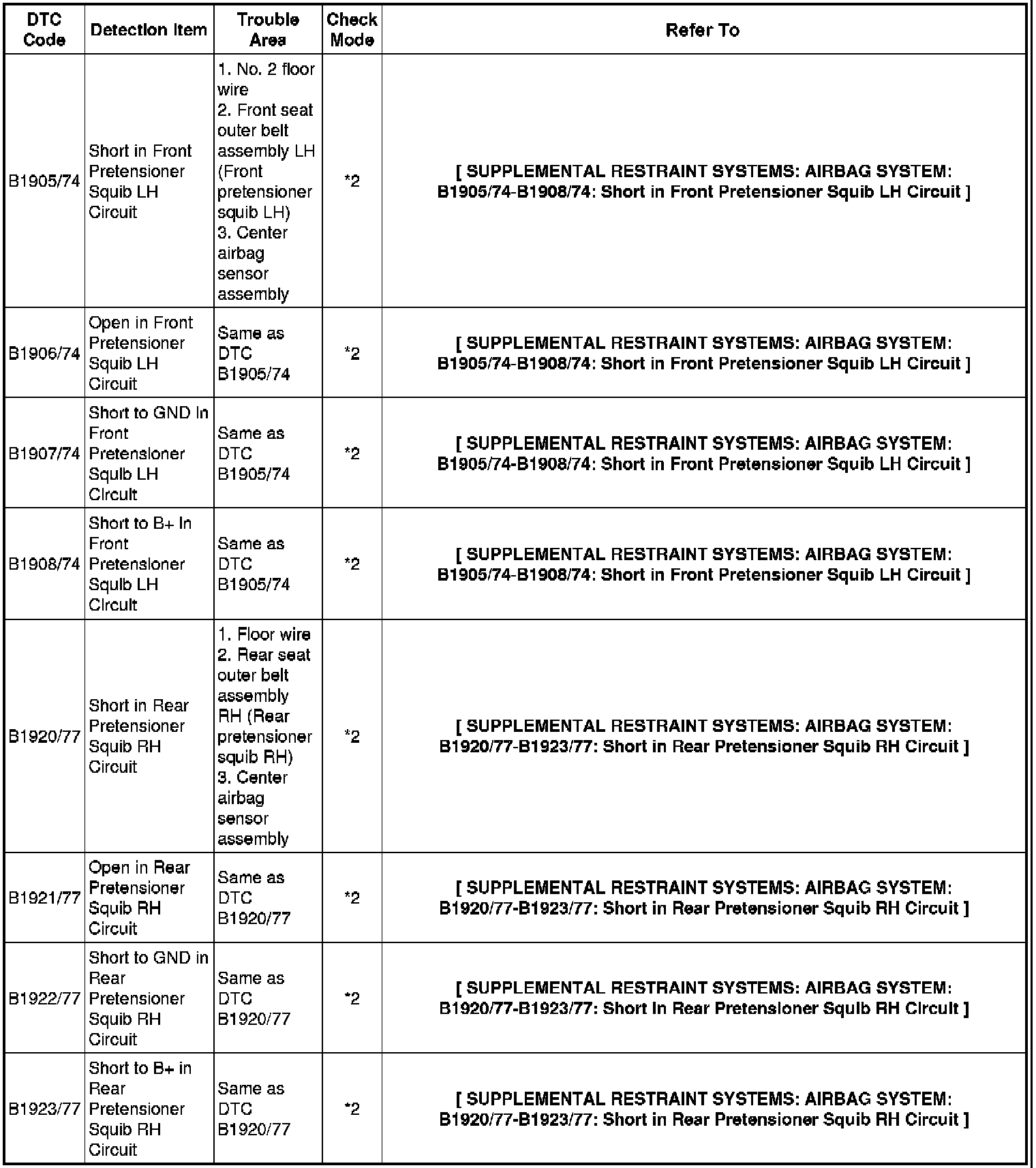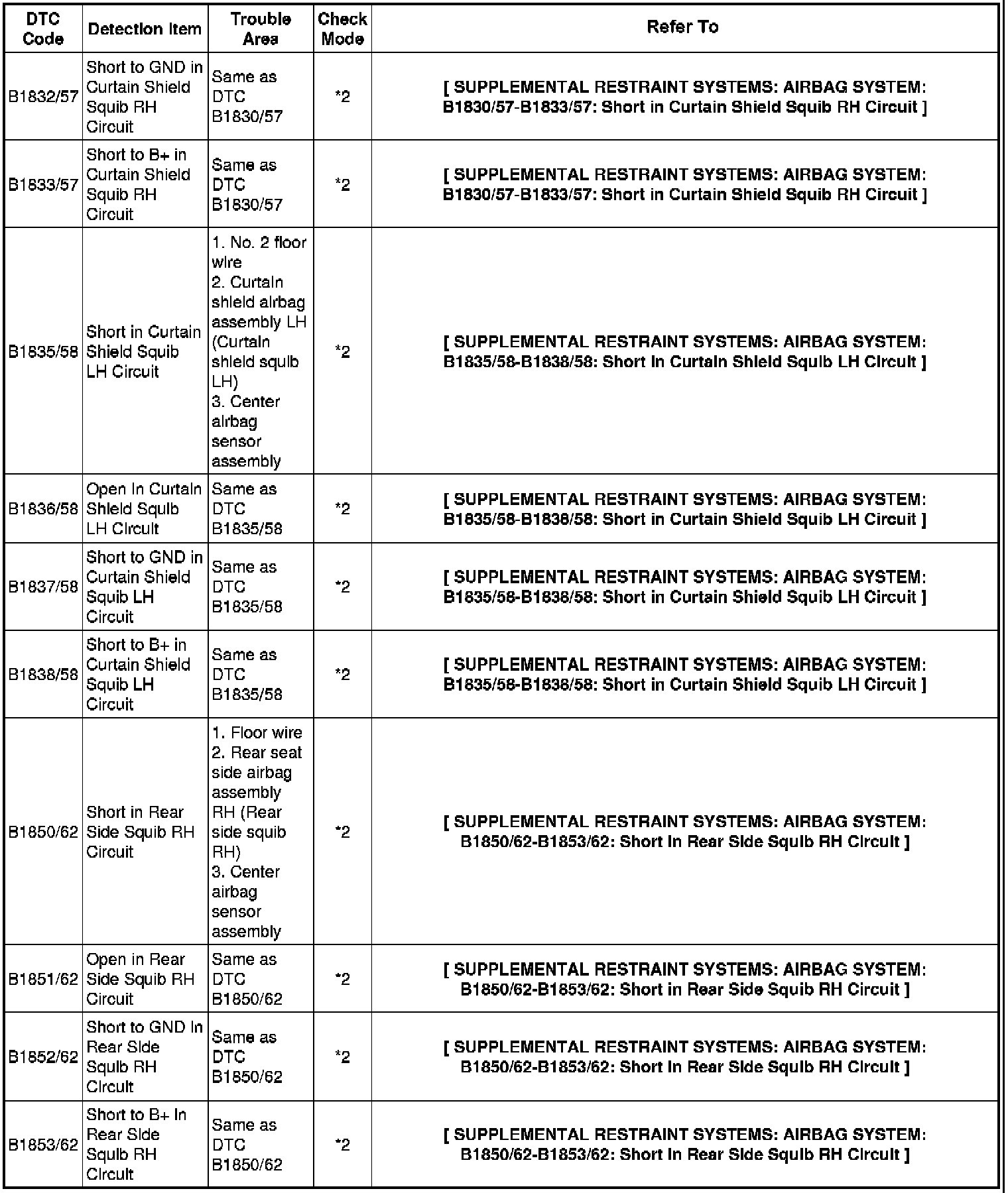 * In the case of any malfunction concerning an open circuit, short to ground, or short to B+ due to a squib, other trouble codes may not be detected. In this case, repair the malfunction currently indicated and then perform malfunction diagnosis again.